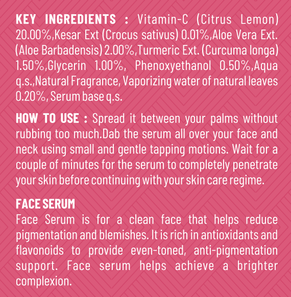 • Ultimate Skin Brightening Formula: Infused with Vitamin-C from lemon and Kesar (saffron), this serum works to naturally brighten your skin, leaving it looking luminous and refreshed.